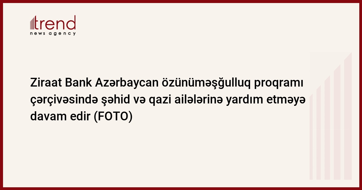 Sosial layihələrin həyata keçirilməsinə daim xüsusi diqqət ayıran “Ziraat Bank Azərbaycan” ASC, Özünüməşğulluq proqramı çərçivəsində şəhid və qazi ailələrdən olan şəxslərə, müharibə veteranlarına müxtəlif sahələr üzrə sahibkarlıq fəaliyyətə başlamaq məqsədilə dəstək olmağa davam edir. Bu dəfə bank proqram çərçivəsində Birinci Qarabağ müharibəsində iştirak etmiş iki şəxsi lazımi avadanlıqla təmin etmişdir. Belə ki, bank həm musiqi, həm də avtoçilingər xidmətlərinin göstərilməsi sahəsində sahibkarlıq fəaliyyətinə başlamaq istəyən Birinci Qarabağ müharibəsi iştirakçılarının istəklərini həyata keçirərək bütün lazımi avadanlıqlarla şəxsləri təmin etmiş və sahibkarlığa başlamalarına təkan vermişdir.