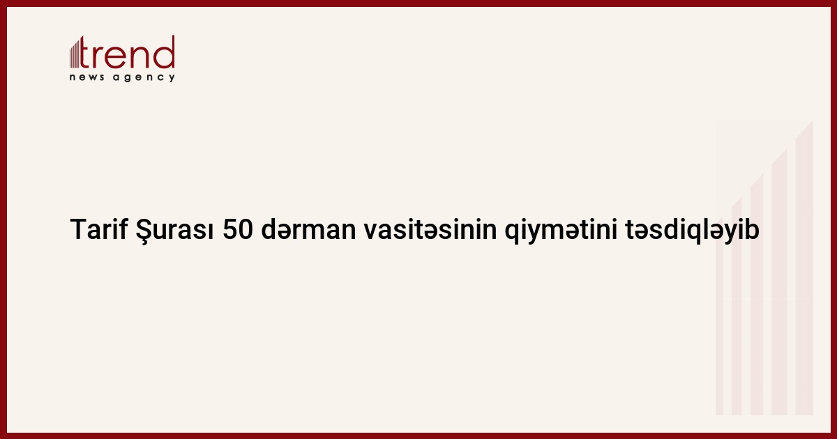 Trend Tarif Şurasının Katibliyinə istinadən xəbər verir ki, iclasda yeni dövlət qeydiyyatına alınan 50 dərman vasitəsinin qiyməti təsdiq edilib və etibarlı təchizatın təmin olunması məqsədilə Səhiyyə Nazirliyindən müvafiq rəy alınmış 32 dərman vasitəsinin qiymətində Nazirlər Kabinetinin 2015-ci il 3 iyun tarixli 209 nömrəli Qərarı ilə təsdiq edilmiş Qaydalara və Tarif (qiymət) Şurasının 2015-ci il 21 iyul tarixli Qərarı ilə təsdiq edilmiş Təlimata uyğun olaraq dəyişikliklər olunub.