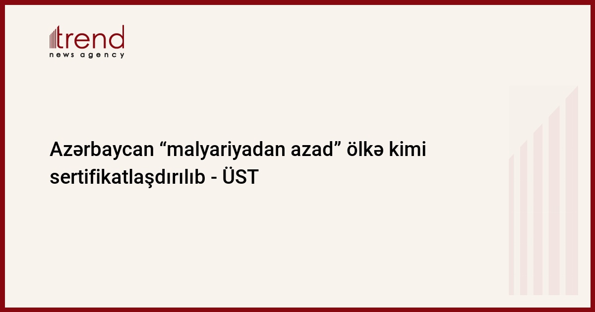 Ümumdünya Səhiyyə Təşkilatı (ÜST) Azərbaycan və Tacikistanı “malyariyadan azad” ölkə kimi sertifikatlaşdırıb.