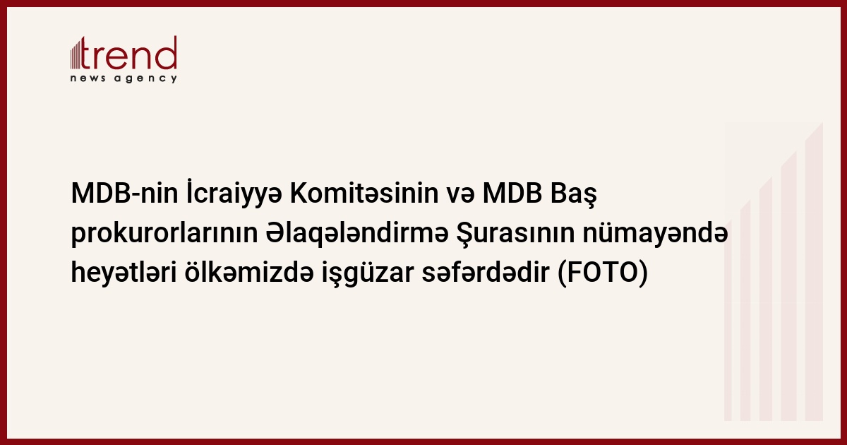 Bakıda keçiriləcək MDB Dövlətlərinin Baş Prokurorlarının Əlaqələndirmə Şurasının (BPƏŞ) 33-cü iclasında iştirak etmək üçün Baş prokuror Kamran Əliyevin dəvətilə MDB dövlətləri Baş prokurorlarının Əlaqələndirmə Şurası və İcraiyyə Komitəsini təmsil edən nümayəndə heyətləri ölkəmizə işgüzar səfərə gəlib.