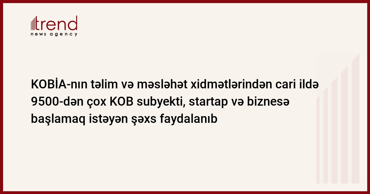 Ümumilikdə, 2023-cü ilin 9 ayı ərzində KOBİA tərəfindən göstərilən ödənişsiz təlim və məsləhət xidmətlərindən 9500-dən çox KOB subyekti, startap və biznesə başlamaq istəyən şəxs yararlanıb.
