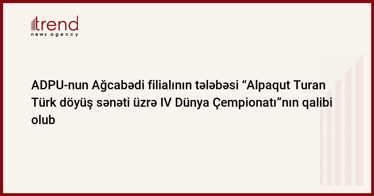 Azərbaycan Dövlət Pedaqoji Universitetinin (ADPU) Ağcabədi filialının “Tarix müəllimliyi” ixtisasının II tədris ilinin tələbəsi Qənbər Ağayev 1-4 dekabr tarixlərində Türkiyə Respublikasının Bursa şəhərində keçirilən “Alpaqut Turan Türk döyüş sənəti üzrə IV Dünya Çempionatı”nda 18-35 yaş, 60-65 kq çəki dərəcəsində “Ayça” ve “Caymaz” sistemleri üzrə bütün rəqiblərinə qalib gələrək fəxri kürsünün ən yüksək pilləsində yer alıb. Qənbər “Ayça” sistemində İran və Türkiyədən olan idmançılara, “Caymaz” sistemində isə Əfqanıstan və Türkiyə idmançılarına qalib gələrək hər iki sistem üzrə ayrılıqda I yerin sahibi olub.