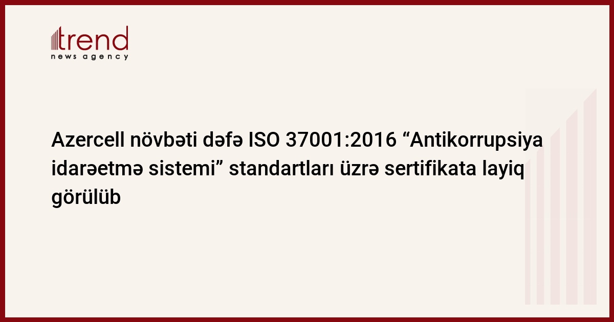 “Azercell Telekom” MMC ISO 37001:2016 “Antikorrupsiya idarəetmə sistemi” standartları üzrə sertifikatını uğurla yeniləyib. ABŞ-ın ən böyük akkreditasiya qurumu olan ANAB (ANSI National Accreditation Board) tərəfindən akkreditə olunmuş Türkiyənin Denetik Belgelendirme şirkətinin 30-31 oktyabr 2023-cü il ərzində keçirdiyi sertifikatlaşdırma auditi Azercell-in antikorrupsiya proqramının bütün tələblərə cavab verdiyini bir daha təsdiq edib və sertifikatın vaxtı üç ilədək uzadılıb. ISO 37001 standartı Beynəlxalq Standartlaşdırma Təşkilatı (ISO) tərəfindən 2016-cı ildə dərc edilib və korrupsiyaya qarşı mübarizə sahəsində qlobal səviyyədə qəbul edilmiş yeganə standart hesab edilir.