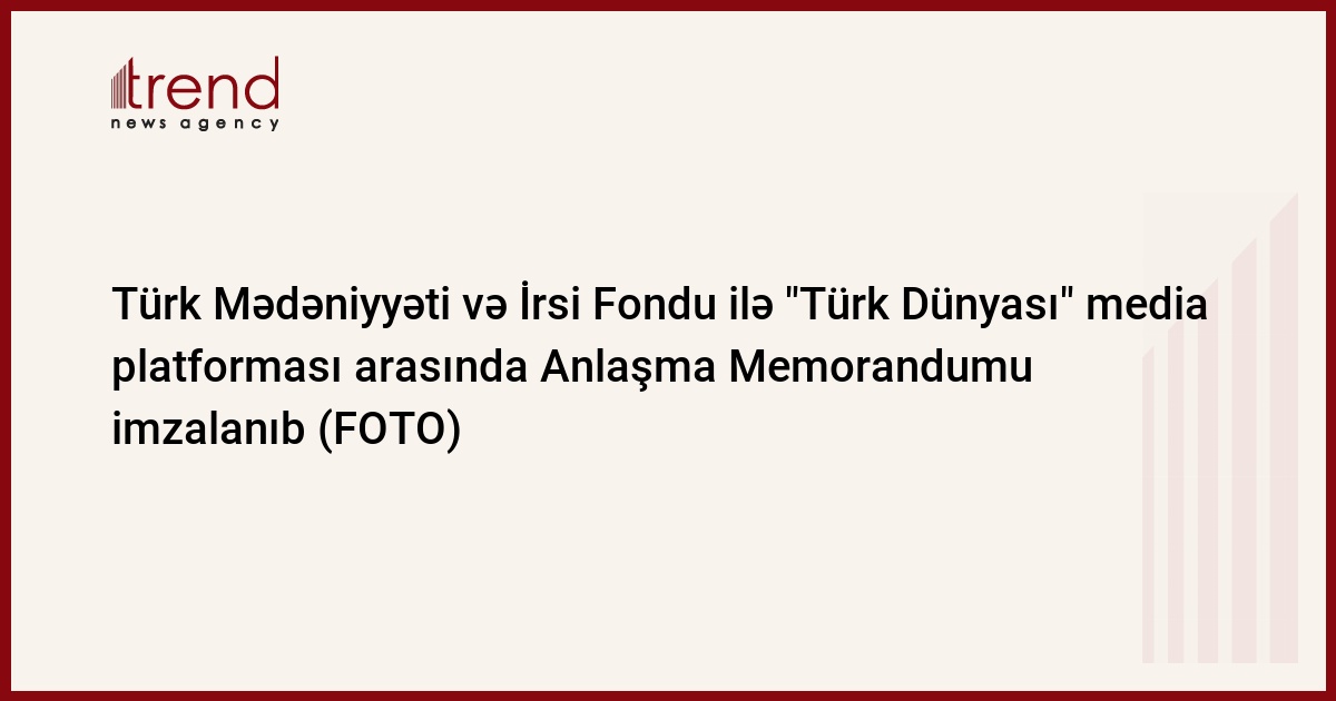 Türk Mədəniyyəti və İrsi Fondu ilə "Türk Dünyası" media platforması arasında ortaq tarixi köklərə sahib Türk xalqlarının mədəni irsinin qorunması, beynəlxalq miqyasda təbliği yönündə Fondun fəaliyyətinin tanıdılması və işıqlandırılması məqsədilə Anlaşma Memorandumu imzalanıb.