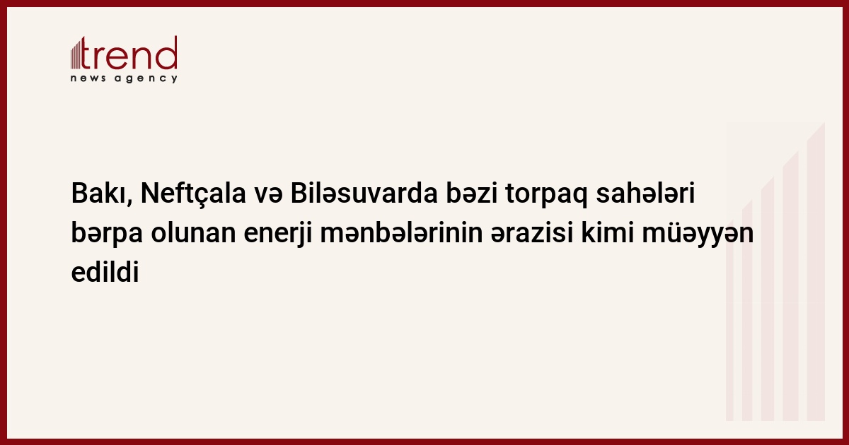 Bakı şəhəri, Qaradağ və Abşeron rayonunun inzibati ərazilərində dövlət və bələdiyyə mülkiyyətinə aid bəzi torpaq sahələri bərpa olunan enerji mənbələrinin ərazisi kimi müəyyən edilib.