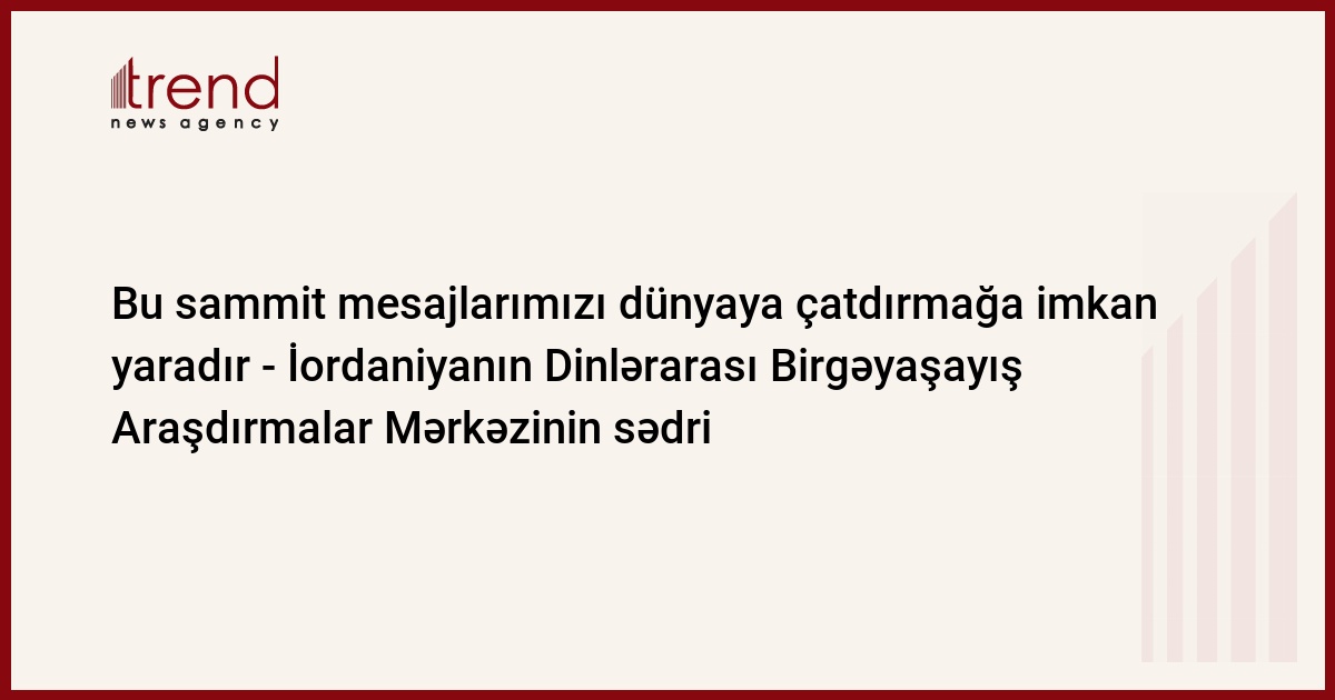 Trend-in məlumatına görə, bunu İordaniyanın Dinlərarası Birgəyaşayış Araşdırmalar Mərkəzinin sədri Nabil Haddad Dini Liderlərin Qlobal Bakı Sammitinin ikinci günündə deyib.