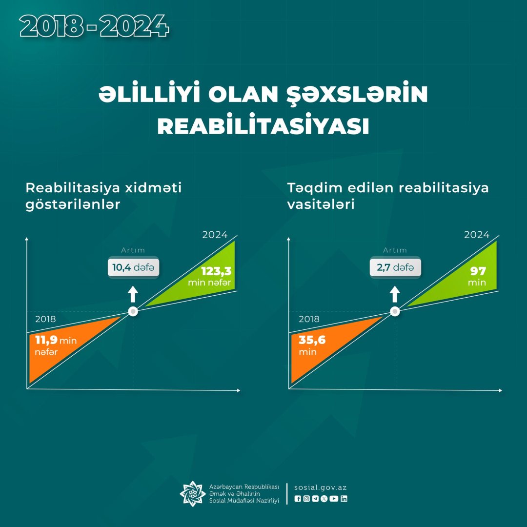 2018-2024-cü illərdə reabilitasiya xidməti göstərilənlərin illik sayı 10,4 dəfə, verilən reabilitasiya vasitələrinin illik sayı isə 2,7 dəfə artıb.