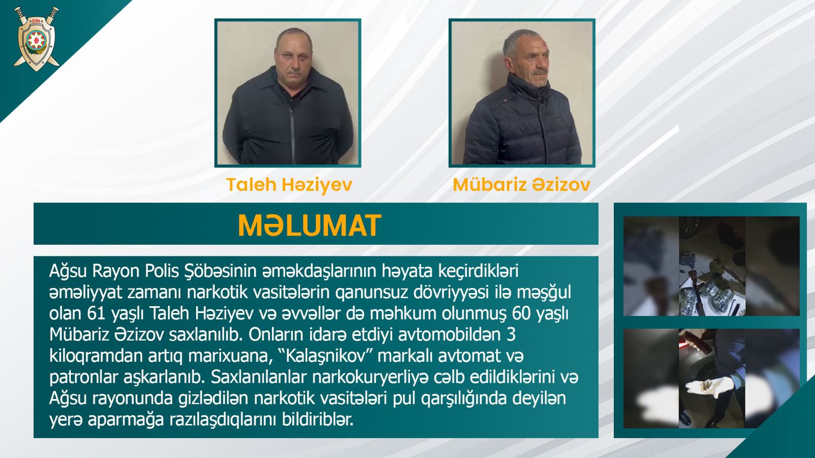 Ağsu Rayon Polis Şöbəsinin əməkdaşlarının həyata keçirdikləri əməliyyat zamanı narkotik vasitələrin qanunsuz dövriyyəsi ilə məşğul olan 61 yaşlı Taleh Həziyev və əvvəllər də məhkum olunmuş 60 yaşlı Mübariz Əzizov saxlanılıb.