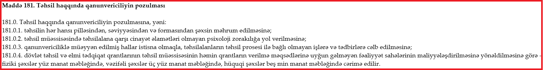 Qeyd edək ki, İnzibati Xətalar Məcəlləsinə əsasən, təhsil