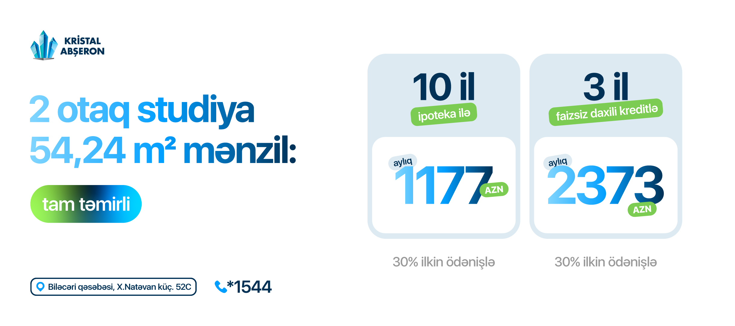 - 030% ilkin ödəniş və 10 illik ipoteka ilə aylıq 1177 AZN və ya;