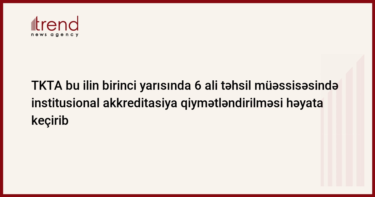 2025-ci təqvim ilinin birinci yarısında Təhsildə Keyfiyyət Təminatı Agentliyi (TKTA) tərəfindən 6 ali təhsil müəssisəsində (ATM) institusional akkreditasiya qiymətləndirilməsi həyata keçirilib.