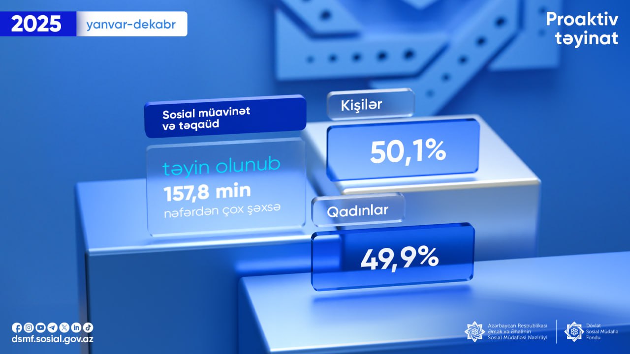 2025-ci ilin yanvar-dekabr ayları ərzində 157,8 min nəfərdən çox şəxsə proaktiv qaydada sosial müavinət (aylıq və birdəfəlik) və təqaüd təyin olunub.