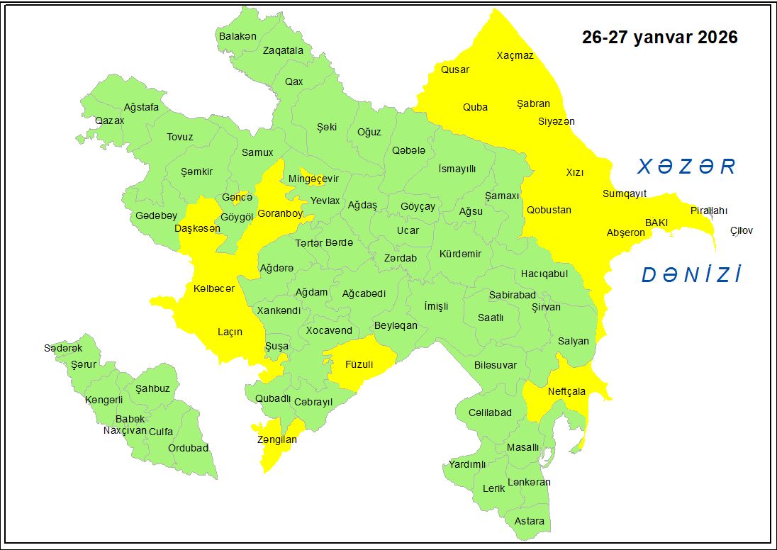 Yanvarın 26-sı gündüzdən 27-si gündüzədək Bakıda və Abşeron yarımadasında, eyni zamanda əksər bölgələrdə gözlənilən küləkli hava şəraiti ilə bağlı sarı xəbərdarlıq verilib.