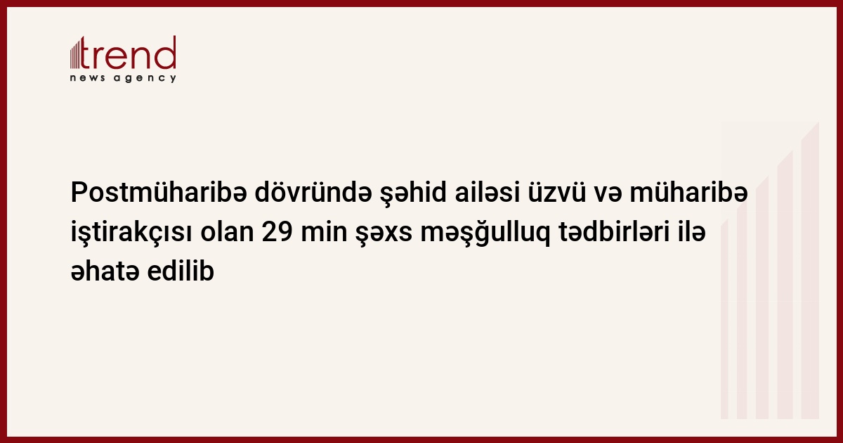 Bildirilir ki, Əmək və Əhalinin Sosial Müdafiəsi Nazirliyinin tabeliyində Dövlət Məşğulluq Agentliyi tərəfindən postmüharibə dövründə bu kateqoriyalara aid olan 29 min şəxs məşğulluq tədbirlərinə cəlb edilib.