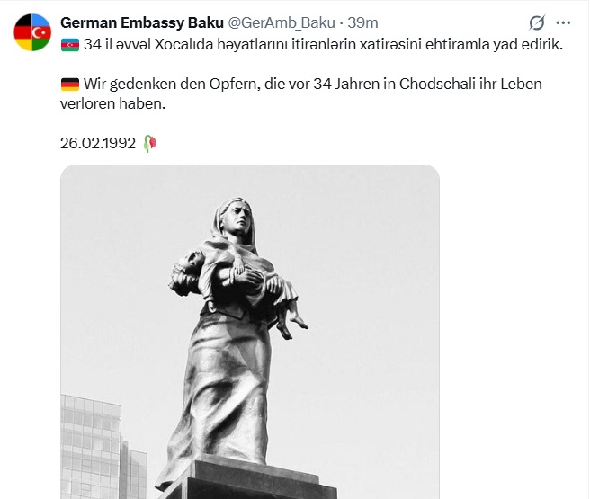 Trend xəbər verir ki, bu barədə Almaniyanın Azərbaycandakı səfirliyinin rəsmi "X" səhifəsində dərc olunan paylaşımda deyilir.
