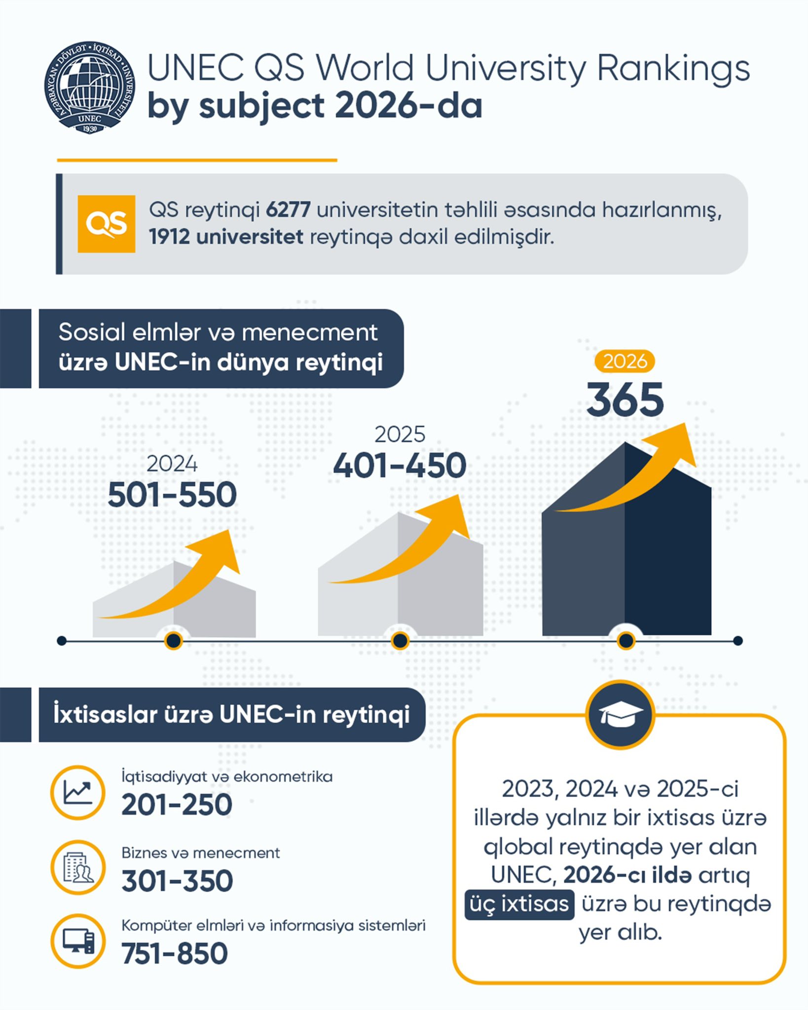 Ən önəmlisi isə UNEC 2023-2025-ci illərdə ancaq bir ixtisasla, 2026-cı ildə isə artıq 3 ixtisasla qlobal reytinqdə təmsil olunub.