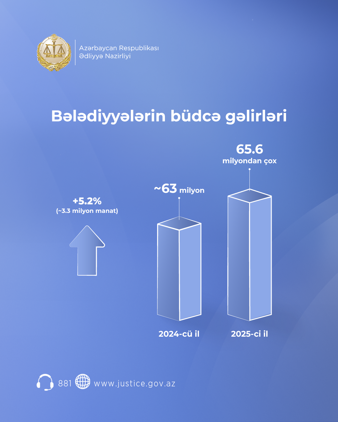 Dövlət Statistika Komitəsinin 2025-ci il üzrə bələdiyyə büdcələrinin icrası barədə məlumatına əsasən, ölkə üzrə bələdiyyələrin büdcə gəlirləri əvvəlki illə müqayisədə təxminən 3,3 milyon manata (5,2 %) yaxın artaraq 65,6 milyon manatı keçib.