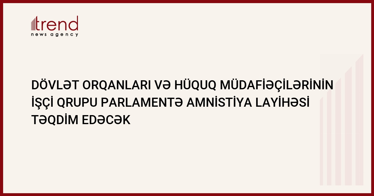 Dövlət orqanları nümayəndələri ilə hüquq müdafiəçilərinin birgə işçi qrupunun bu günlərdə keçiriləcək iclasında amnistisiya layihəsinə rəy veriləcək. Bu barədə Trend ə işçi qrupunun üzvü, hüquq müdafiəçisi Murad Sadəddinov məlumat verib. O, bildirib ki, amnistiya ilə bağlı hüquq müdafiəçiləri tərəfindən layihə hazırlanıb işçi qrupuna təqdim olunmuşdu.