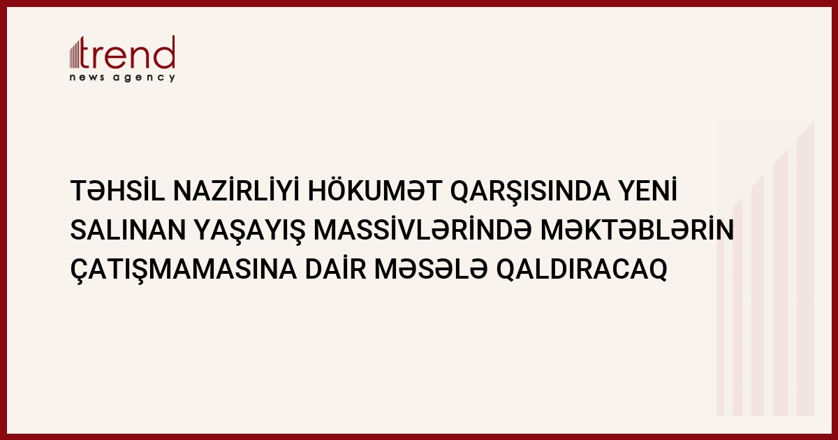 Azərbaycan təhsil nazirliyinin rəhbərliyi yaxın vaxtlarda hökumətin müvafiq strukturları qarşısında Bakının yeni salınan yaşayış massivlərində məktəblərin çatışmaması ilə bağlı məsələ qaldıracaq. Nazirliyin ötən müşavirəsində bu barədə qərar qəbul edilib.Bu barədə Trend agentliyinə idarədə bildirilib.
