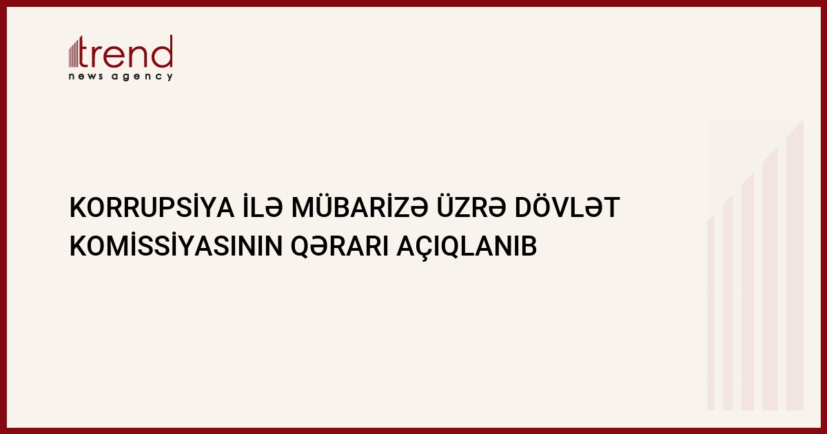 Azərbaycanın Dövlət İdarəetmə Qulluğu yanında korrupsiya ilə mübarizə üzrə Komissiyanın 4-cü iclasının qərarı açıqlanıb. Trend in məlumatına görə, Azərbaycanın Nazirlər Kabinetinə komissiyaya binanın ayrılması və onun maddi-texniki bazasının təmin olunmasına dair məktub göndərilib.