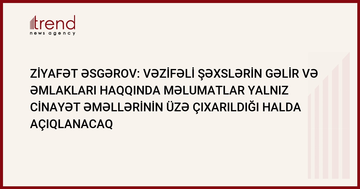 Azərbaycanın vəzifəli şəxslərinin gəlirləri və əmlakları haqqında məlumatlar konkret cinayət əməllərinin üzə çıxarıldığı zaman açıqlanacaq. Bu barədə Trend ə Milli Məclisin vitse-spikeri, Azərbaycanın dövlət qulluğu idarəetmə şurası yanında korrupsiya ilə mübarizə üzrə Komissiyanın üzvü Ziyafət Əsgərov bildirib.