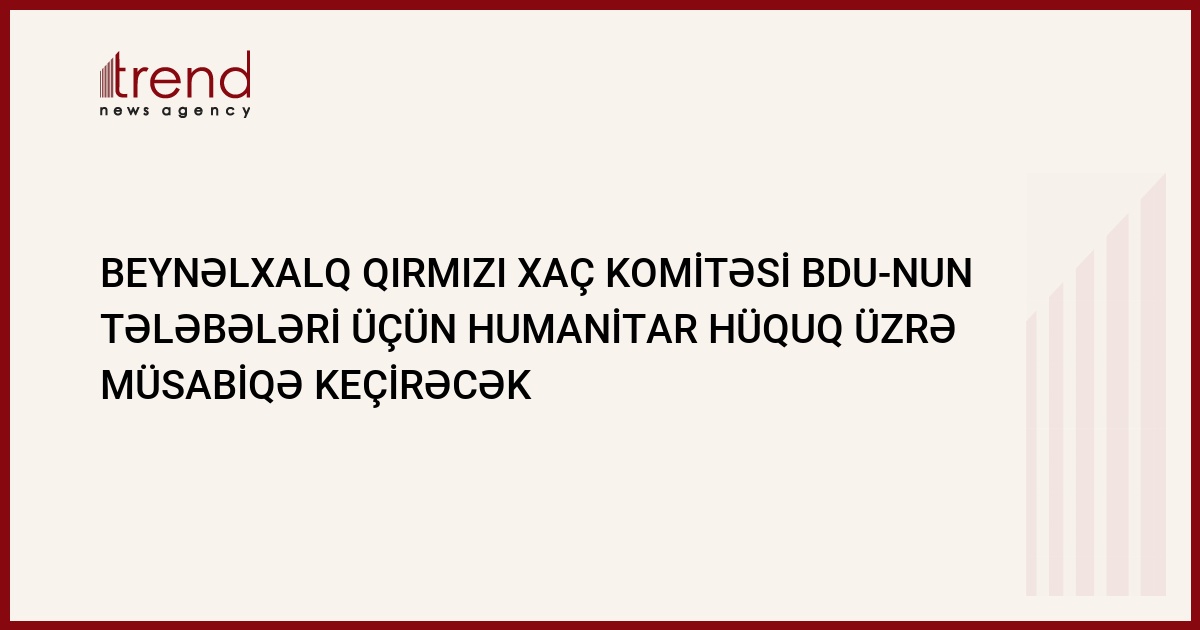 Beynəlxaq Qırmızı Xaç Komitəsi noyabrın 10-13-də Bakı Dövlət Universitetinin tələbələri üçün humanitar beynəlxalq hüquq üzrə ikinci müsabiqə keçirməyi planlaşdırır. BQXK-nın Bakı nümayəndəliyindən Trend ə verilən məlumata görə, müsabiqə beynəlxalq hüquq, hüquq və beynəlxalq münasibətlər fakultəsinin tələbələri üçün keçiriləcək.