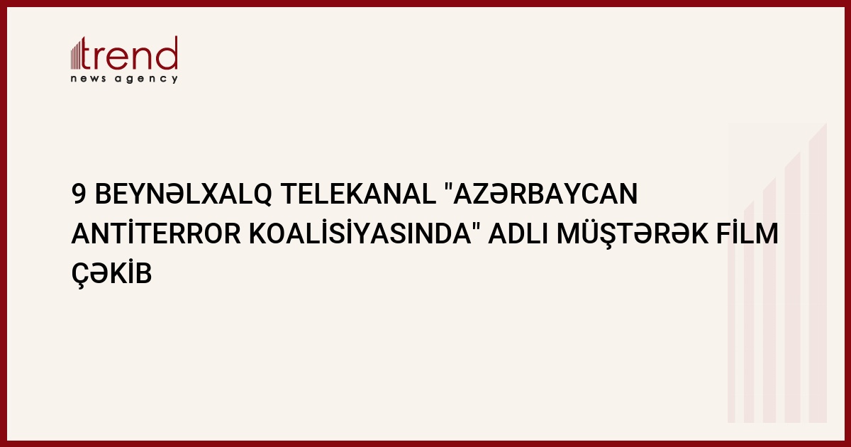 9 beynəlxalq telekanal (ABŞ, Fransa, İtaliya, Yaponiya, İngiltərə, Səudiyyə Ərəbistanı və s.) "Azərbaycan antiterror koalisiyasında" adlı müştərək film çəkib. Bu barədə Trend ə Terrorizmə və korrupsiyaya qarşı "Bank-informasiya" strateji araşdırmalar mərkəzinin direktoru, politoloq Rövşən Novruzoğlu məlumat verib.