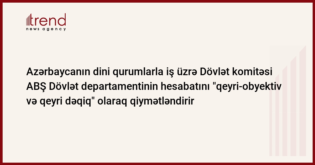 Azərbaycanın dini qurumlarla iş üzrə Dövlət komitəsi təəssüf edir ki, ABŞ Dövlət departamentinin dünyada dini azadlıqlara riayət edilməsinə dair illik hesabatında real vəziyyət deyil, dini icma qruplarının "qeyri-obyektiv, dəqiq olmayan və fakta əsaslanmayan" iradları əks olunub.