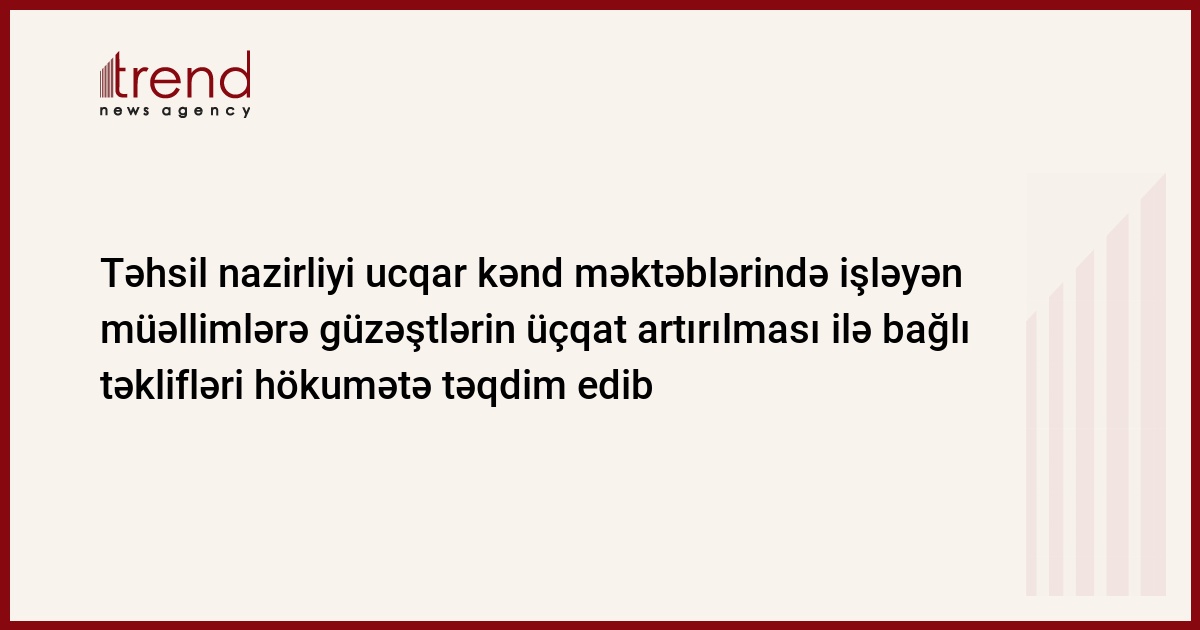Azərbaycanın Təhsil nazirliyi ucqar kənd məktəblərində işləyən müəllimlərə güzəştlərin üçqat artırılması ilə bağlı təklifləri hökumətə təqdim edib. Bu barədə Trend ə təhsil naziri Misir Mərdanov məlumat verib.