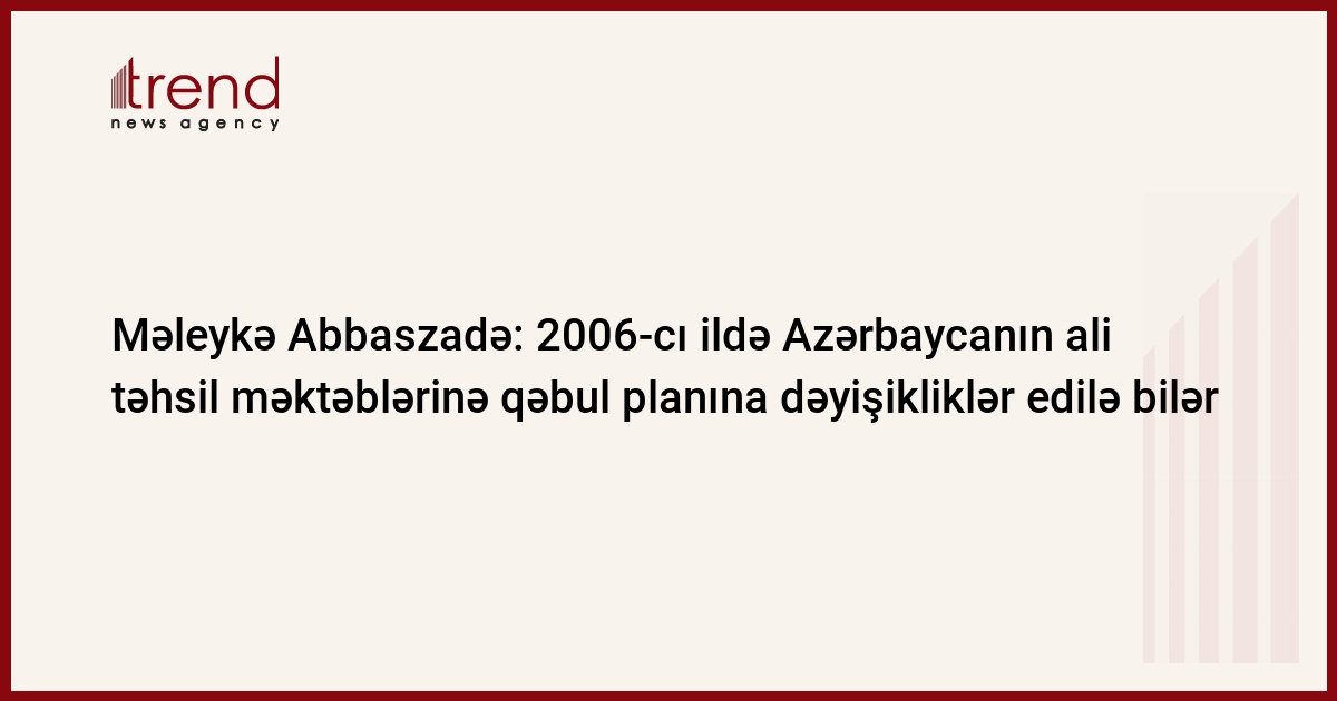 2006-cı ildə Azərbaycanın ali təhsil məktəblərinə qəbul planına dəyişikliklər edilə bilər. Trend in xəbər verdiyi kimi, bu barədə jurnalistlərə Tələbə Qəbulu üzrə Dövlət Komissiyasının sədri Məleykə Abbaszadə bildirib.