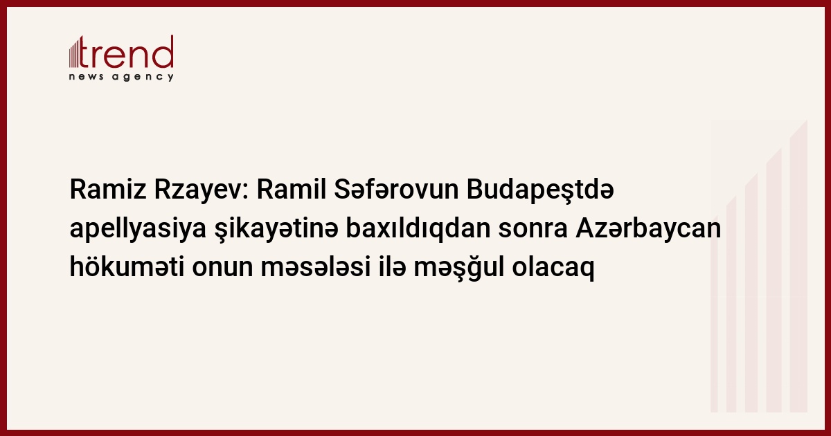 Yaxın aylarda Azərbaycan hökuməti Macarıstanın Budapeşt şəhər Məhkəməsi tərəfindən ömürlük həbsə məhkum edilmiş azəırbaycanlı zabit Ramil Səfərovun məsələsi ilə məşğul olacaq. Trend in xəbərinə görə, bu barədə Azərbaycan Respublikası Ali Məhkəməsinin sədri Ramiz Rzayev məlumat verib.