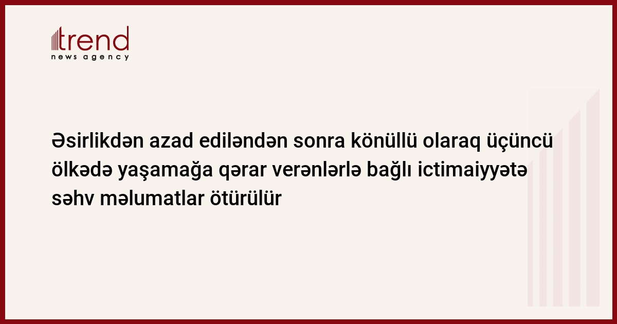 Son vaxtlar əsirlikdən azad edilmiş şəxslərin həbs edilməsi və üçüncü ölkəyə göndərilənlərin yaxınlarının təqib olunması ilə bağlı ictimaiyyətə məqsədli şəkildə səhv məlumatlar ötürülür. Bu barədə Trend ə Azərbaycan Respublikası Əsir və İtkin Düşmüş, Girov Götürülmüş Iətəndaşlarla Əlaqədar Dövlət Komissiyasından məlumat verilib.