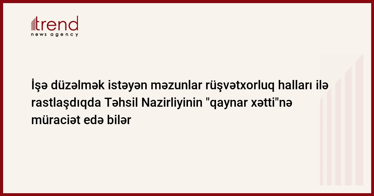 Pedaqoji profilli təhsil müəssisələrinin məzunları işə düzələn zaman rüşvətxorluqla rastlaşdıqda, Təhsil Nazirliyinin "qaynar xətti"nə müraciət edə bilər. Bu barədə Trend ə Nazirlikdən bildirilib.