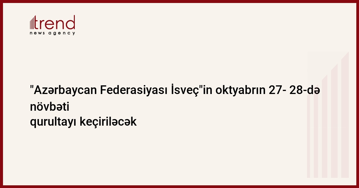 İsveçdə fəaliyyət göstərən Azərbaycan diaspor təşkilatı "Azərbaycan Federasiyası İsveç"in (AFİ) bu il oktyabrın 27- 28-də növbəti qurultayı keçiriləcək. Bu barədə Trend ə AFİ-dən məlumat verilib.