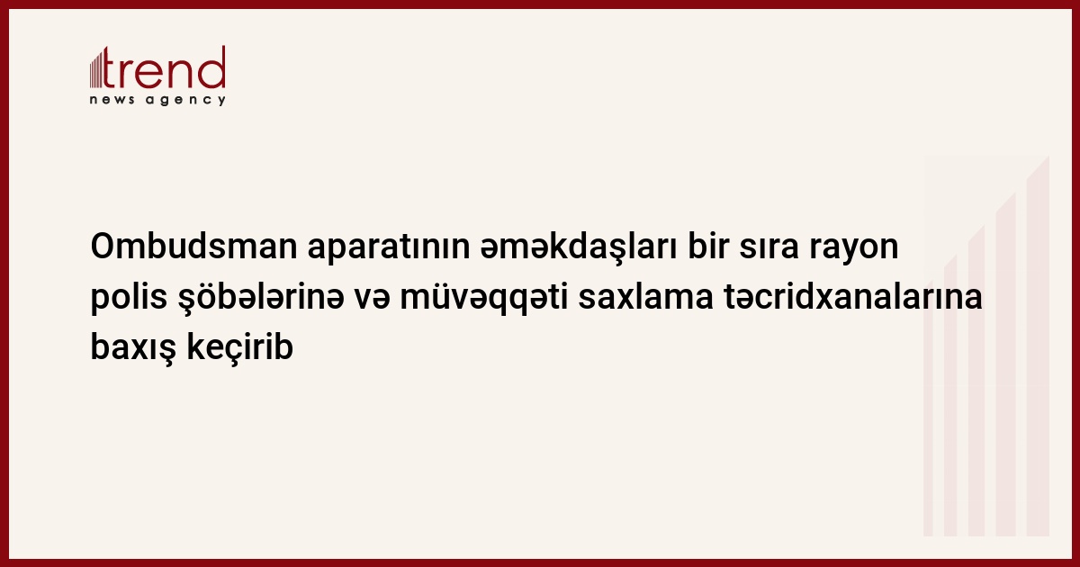 Azərbaycanın insan haqları üzrə səlahiyyətli müvəkkili aparatının əməkdaşları Bakının bir sıra rayonlarındakı polis şöbələrinə və müvəqqəti saxlama təcridxanalarına baxış keçirib. Bu barədə Trend ə ombudsman aparatından məlumat verilib.