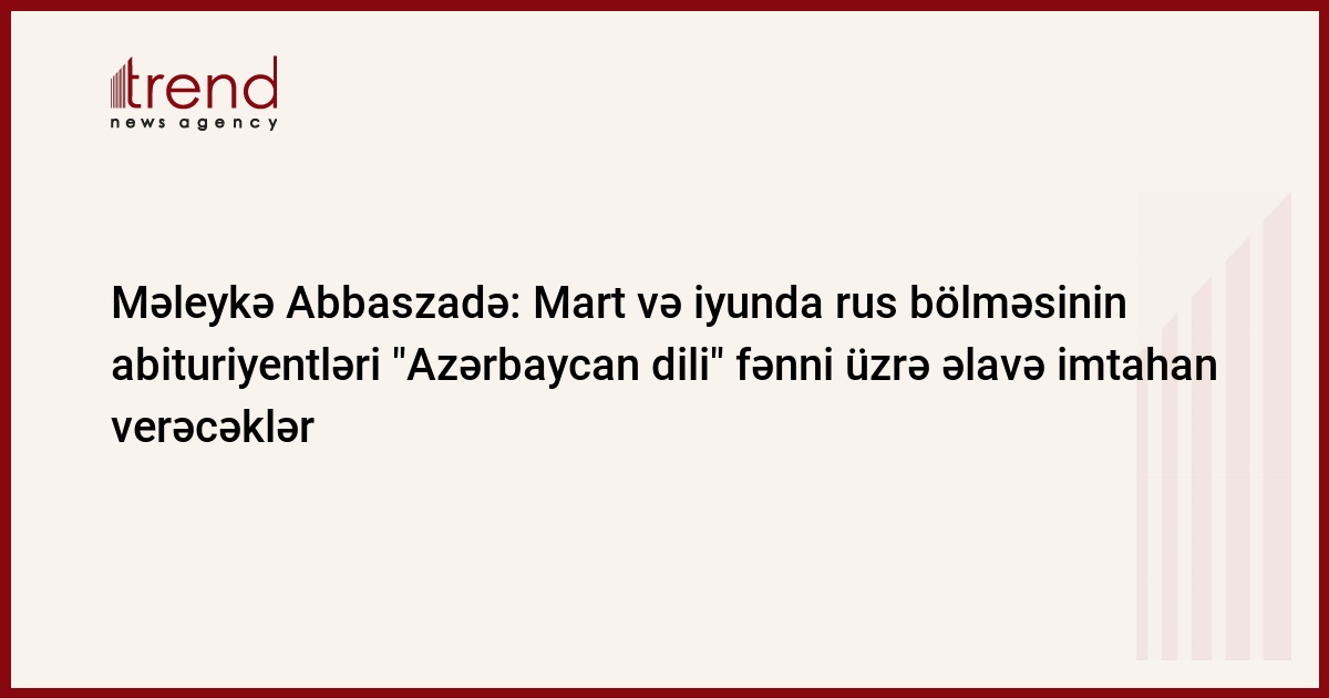 "Rus bölməsinin abituriyentlərinə əsas imtahanlardan əvvəl əlavə olaraq "Azərbaycan dili" fənni üzrə imtahan keçiriləcək. İmtahanda abituriyentlərə 20 test tapşırığı təqdim olunacaq. İmtahanlar məqbul və qeyri-məqbulla qiymətləndiriləcək. Bu imtahanların mart və iyun aylarında keçirilməsi nəzərdə tutulur. Mart ayında keçirilən imtahanda məqbul ala bilməyənlərə iyun ayında təkrar imtahanda iştirak etmək imkanı veriləcək" - deyə M.Abbaszadə qeyd edib.