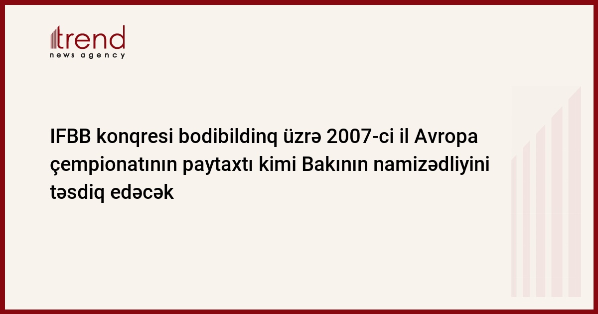 İstirahət günləri Ostravda (Çexiya) keçiriləcək Beynəlxalq Bodibildinq Federasiyası Konqresində (IFBB) Bakı rəsmi şəkildə 2007-ci il Avropa çempionatının təşkilatçısı qismində təsdiq olunacaq.