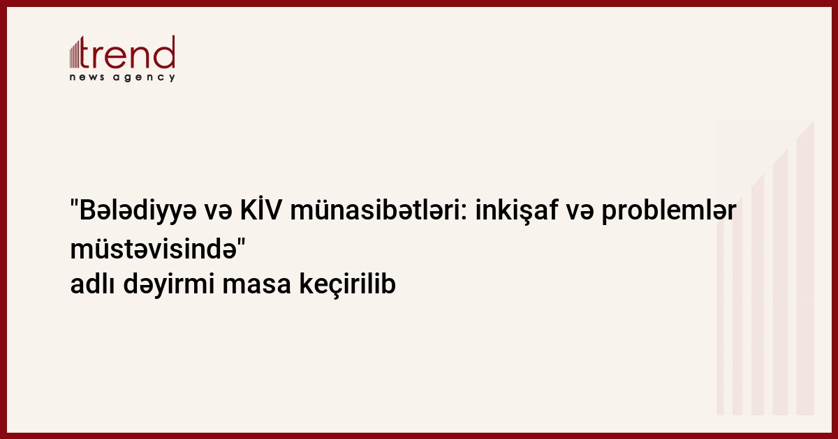 Azərbaycanda Vətəndaş Cəmiyyətinin İnkişafına Yardım Assosiasiyasının (AVCİYA) təşkilatçılığı ilə noyabrın 9-da Beynəlxalq Mətbuat Mərkəzində "Bələdiyyə və KİV münasibətləri: inkişaf və problemlər müstəvisində" adlı dəyimi masa keçirilib. Trend in məlumatına görə, tədbirdə AVCİYA- nın eksperti Vüqar Tofiqli bələdiyyələrin vəziyyəti, fəaliyyəti barədə məruzə edib.