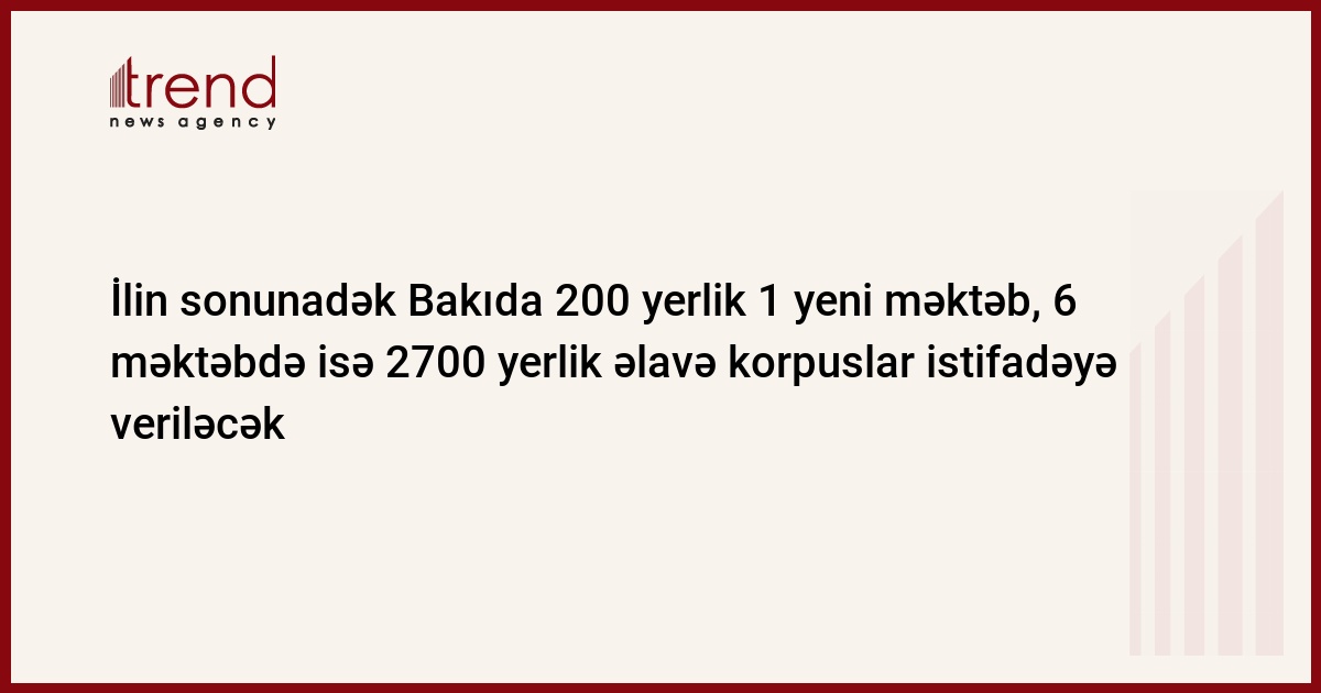 İlin sonunadək Bakıda 200 yerlik 1 yeni məktəb, 6 məktəbdə isə 2700 yerlik əlavə korpuslar istifadəyə veriləcək. Trend in xəbərinə görə, bu barədə noyabrın 16-da Bakı şəhəri üzrə Təhsil İdarəsində keçirilmiş mətbuat konfransında idarənin müdir müavini Məhərrəm Bayramov məlumat verib.