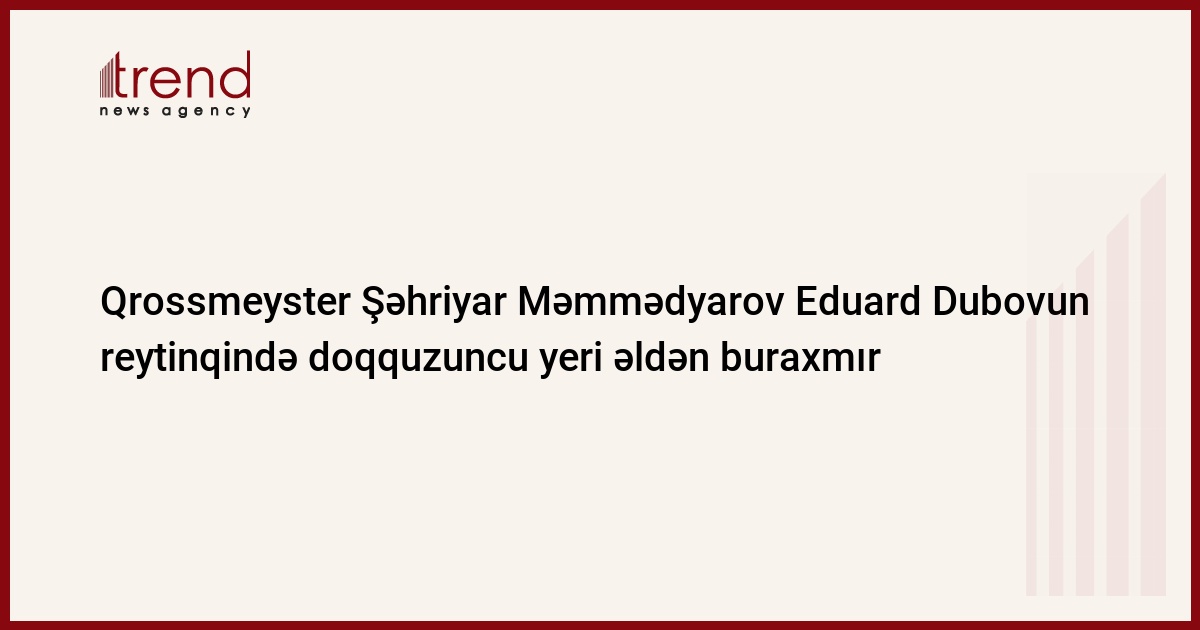 Azərbaycanlı qrossmeyster Şəhriyar Məmmədyarov İsveçrə sistemi üzrə FİDE Komissiyasının üzvü Eduard Dubovun yenilənmiş reytinqində doqquzuncu yerdə dayanıb.