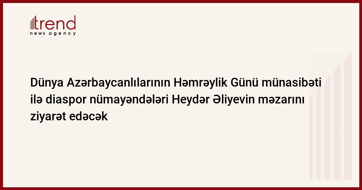 31 dekabr - Dünya Azərbaycanlılarının Həmrəylik Günü münasibəti ilə Xarici Ölkələrdə Yaşayan Azərbaycanlılarla İş üzrə Dövlət Komitəsinin sədri Nazim İbrahimovun rəhbərliyi ilə xaricdən gəlmiş diaspor nümayəndələrimiz Azərbaycanın eks-prezidenti Heydər Əliyevin məzarını ziyarət edəcəklər. Bu barədə Trend ə Xarici Ölkələrdə Yaşayan Azərbaycanlılarla İş üzrə Dövlət Komitəsindən məlumat verilib.