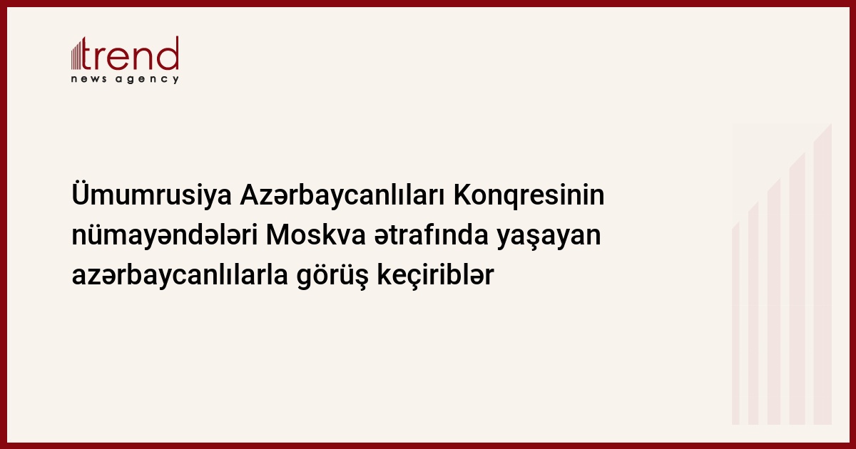Ümumrusiya Azərbaycanlıları Konqresinin (ÜAK) nümayəndələri Moskvaətrafı vilayətlərdə səfərdə olub, azərbaycanlılarla görüş keçiriblər. Bu barədə Trend ə ÜAK-ın Moskva şəhər təşkilatının sədri İlqar Hacıyev məlumat verib.
