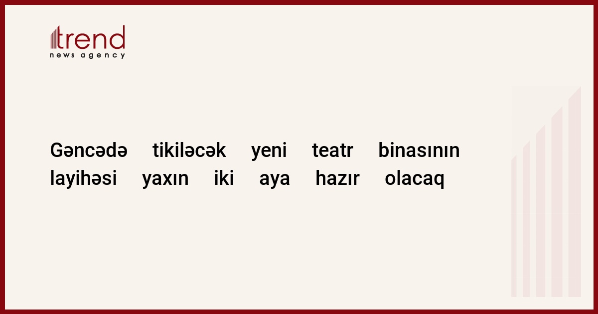 Azərbaycan, Gəncə / Trend müxbir V.Məmmədov/ Gəncədə yeni tikiləcək teatr binasının layihəsi iki aya hazır olacaq. Trendin Qərb Bürosunun bildirdiyinə görə, bu barədə şəhər İcra Hakimiyyəti başçısı Eldar Əzizov məlumat verib.
