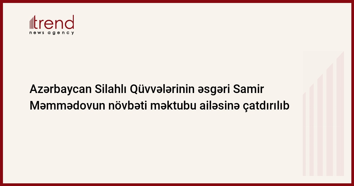 Azərbaycan, Bakı / Trend müxbir K.Zərbalıyeva/ Bu gün Beynəlxalq Qırmızı Xaç komitəsinin nümayəndələri ötən il dekabrün 24-də ermənilər tərəfindən əsir götürülmüş Azərbaycan Silahlü Qüvvələrinin əsgəri, kiçik çavuş Samir Məmmədovun növbəti məktubunu onun ailəsinə çatdırıb. Əsirin əmisi Vidadi Məmmədov bildirib ki, məktubda Samir Məmmədov yaxşı olduğunu yazıb: "Yazır ki, yaxşıyam, mənı fikirləşməyin. Hesab edirik ki, o bu məktutbunu da ermənilərin təsiri altında yazıb. Ona psixoloji təsir göstərilir".