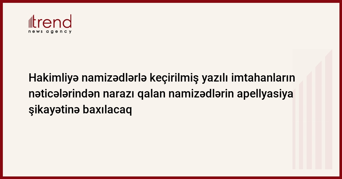 Azərbaycan, Bakı / Trend müxbir K.Zərbalıyeva/ Martın 14-də hakimliyə namizədlərlə keçirilmiş yazılı imtahanların nəticələrindən narazı qalan namizədlərin apellyasiya şikayətinə baxılacaq. Hakimlərin Seçki Komitəsindən verilən məlumata görə, 11 nəfər namizəd imtahanın nəticələrindən şikayət verib. Daxil olmuş həmin müraciətlər ərizəçilərin, müşahidəçilərin və KİV nümayəndələrinin iştirakı ilə Hakimlərin Seçki Komitəsi tərəfindən araşdırılacaq.