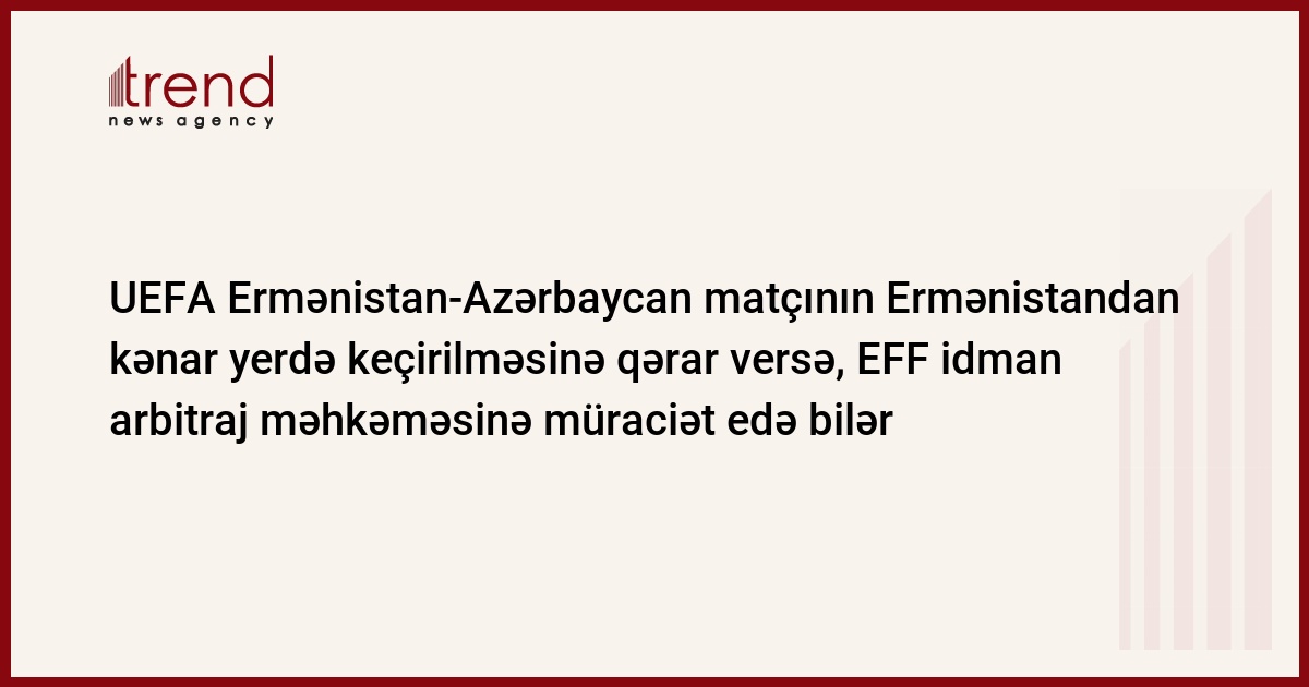 Azərbaycan, Bakı /müx. " Z.Səfərov / Əgər UEFA Ermənistan-Azərbaycan matçının Ermənistandan kənar yerdə keçirilməsinə qərar versə, Ermənistan Futbol Federasiyası (EFF) idman arbitraj məhkəməsinə müraciət edə bilər. Trend in "Reqnum"a istinadən yaydığı xəbərə görə, EFF prezidenti Ruben Ayrapetyan bildirib ki, erməni tərəfi UEFA-nın bütün qərarları ilə razılaşmayacaq. "Bizim etiraz etmək hüququmuz var. Səfər oyunu barədə bir şey deyə bilmərəm. Hansı qərar qəbul olunacaq, onu da icra etməyə və istənilən yerdə oynamağa hazırıq. O ki qaldı ev oyununa, o mütləq Yerevanda keçirilməlidir. Əgər başqa qərar qəbul olunsa, idman arbitraj məhkəməsinə müraciət edəcəyik, bu işi udacağıq və ev oyununu Yerevanda keçirəcəyik. Başqa cür ola bilməz" - deyə Ayrapetyan vurğulayıb.