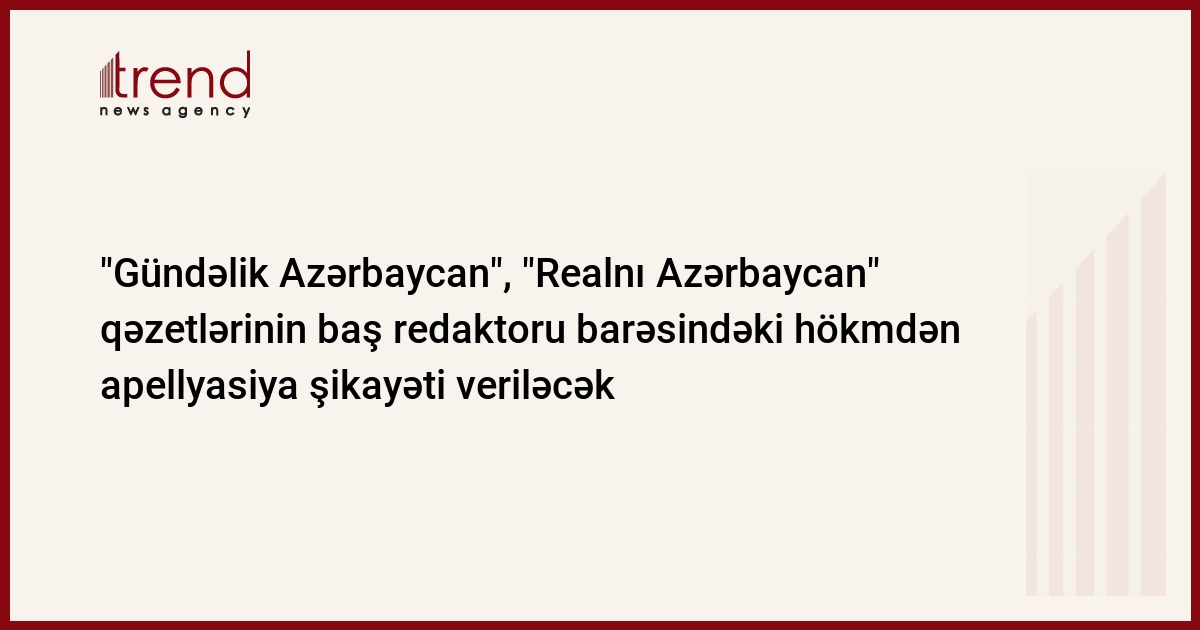Azərbaycan, Bakı / Trend müxbir K Zərbalıyeva/ Yasamal rayon məhkəməsinin hökmü ilə 2 il 6 ay azadlıqdan məhrum edilmiş "Gündəlik Azərbaycan", "Realnı Azərbaycan"qəzetlərinin təsisçi və baş redaktoru Eynulla Fətullayev hazırda Penitensiar Xidmətin Bayıldakı 1 saylı İstintaq Təcridxanasında saxlanılır. Fətullayevin vəkili İsaxan Aşurov şənbə günü bildirib ki, hökmü alandan sonra Apellyasiya Məhkəməsinə şikayət hazırlanacaq və qısa müddətdə apellyasiya şikayəti məhkəməyə təqdim olunacaq. Məhkəmənin qərarını ədalətsiz hesab edən Aşurov həmin qərarın ləğvi üçün bütün instansiyalara müraciət ediləcəyini vurğulayıb.