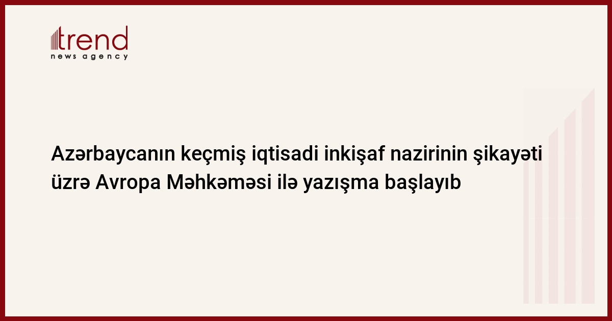 Azərbaycan, Bakı/ Trend müxbir K.Zərbəliyeva/ Azərbaycanın keçmiş iqtisadi inkişaf nazirinin Avropa Insan Haqları Məhkəməsinə şikayəti əsasında yazışma başlayıb. Azərbaycanın Avropa Məhkəməsindəki səlahiyyətli nümayəndəsi Çingiz Əsgərovun bildirdiyinə görə, Avropa Məhkəməsi Azərbaycandan avqust ayına qədər bu iş üzrə məlumat təqdim olunmasını tələb edir.