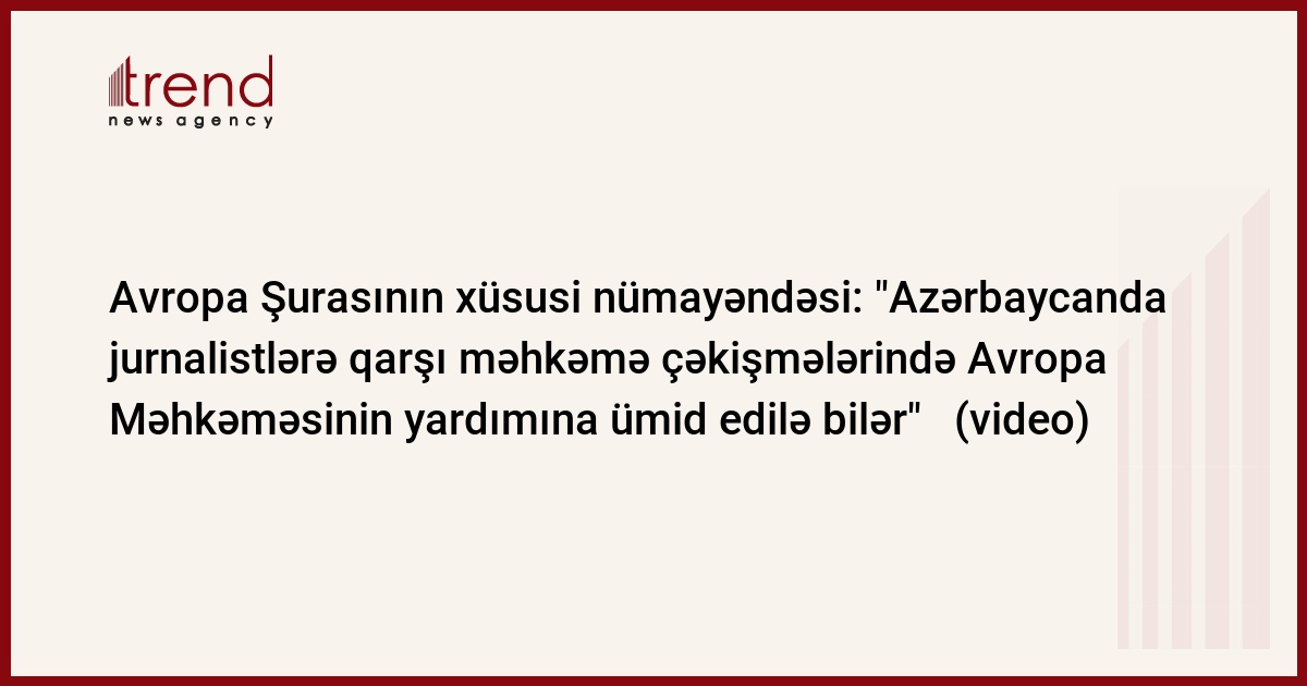 Azərbaycan, Bakı /müx. Trend İ.Əlizadə/ Avropa Şurasının Azərbaycandakı xüsusi nümayəndəsi Denis Bribosia daha iki jurnalistin həbsi ilə bağlı məsələni şərh edib. Bribosianın sözlərinə görə, Avropa Şurasının baş katibi Azərbaycanda 7 jurnalistin həbsi faktı ilə bağlı narahatçılıq keçirir. Avropa Birliyi də Azərbaycanı müvafiq öhdəlikləri yerinə yetirməyə, KİV-lərin fəaliyyətini sığortalamağa çağırıb.