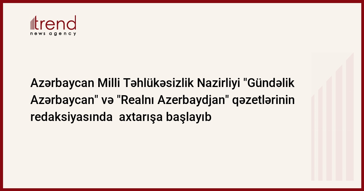 Azərbaycan, Bakı / Trend müxbir K. Zərbalıyeva/ Azərbaycan Milli Təhlükəsizlik Nazirliyi "Gündəlik Azərbaycan" və "Realnı Azerbaydjan" qəzetlərinin redaksiyasında axtarışa başlayıb. Milli Təhlükəsizlik Nazirliyinin İctimaiyyətlə Əlaqələr Mərkəzinin rəhbəri Arif Babayev çərşənbə axşamı Trend ə bildirib ki, nazirliyin İstintaq Baş İdarəsi tərəfindən Azərbaycan Respublikası Cinayət Məcəlləsinin 214-cü maddəsi ilə terrorçuluqla hədələmə faktı üzrə cinayət işi başlanıb. Həmin cinayət işi üzrə "Gündəlik Azərbaycan" və "Realnı Azerbaydjan" qəzetlərinin redaksiyasında yerləşən Eynulla Fətullayevin ofisində, eləcə də onun evində qanunvericiliklə müəyyən edilmiş qaydada axtarış aparılır".